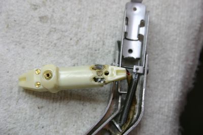 Het element rammelde in de ophanging van de arm. Er leek ook al eens aan gewerkt te zijn en het rode aansluitdraadje was te kort. Het veertje van de elementhouder leek ook anders te zitten dan in de servicemanual getekend is.