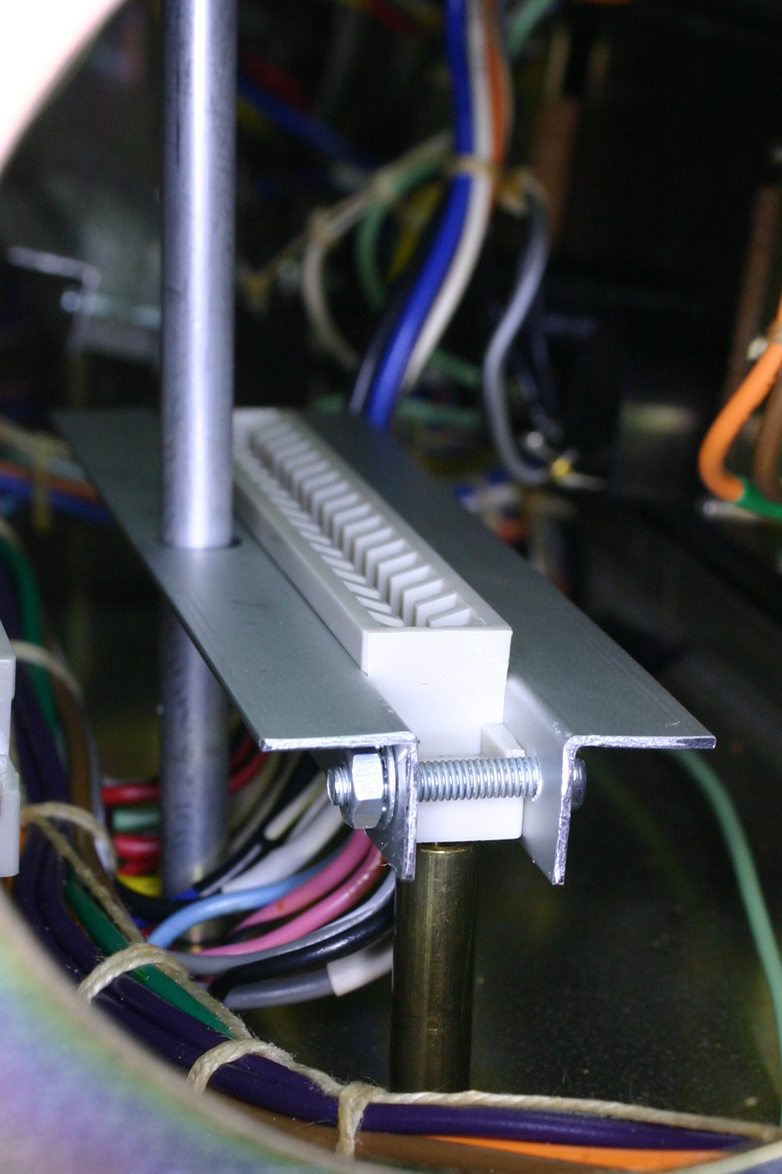 De connector kan niet zo blijven zweven, dat is om nieuwe storingen vragen. Daarom twee nieuwe bevestingingspunten van PVC gemaakt die de connector nu op zijn plaats houden. De steuntjes zitten vastgeschroefd met een schroefje door de bevestigingsgaten van de oude connector.