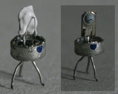 Uit nieuwsgierigheid heb ik een AC125 die ook in het bakje lag en ook kapot bleek te zijn eens open gezaagd. In de binnenkant zit de transistor in een soort koelpasta. Die heb ik weggespoeld met wasbenzine en dan komt de de transistor rechts op de foto tevoorschijn. Kristallen kon ik niet ontdekken, maar die kunnen mee opgelost zijn in de wasbenzine. Hij bleef in elk geval kapot.