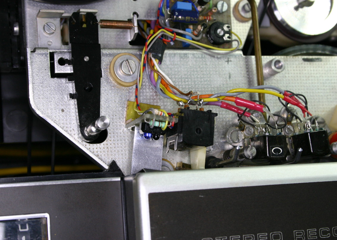 De originele weerstand op de hoofdprint heb ik laten zitten. Een extra serieweerstand is aan de handle van de rechtse schakelaar (bandsnelheid) gesoldeerd. De LEDs zijn in serie geschakeld en de bedrading is zoveel mogelijk hetzelfde gebleven: de parallelle bedrading is veranderd in een seriele.