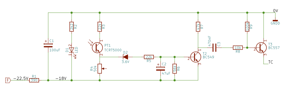 De optotransistor geleidt als het licht gereflecteerd wordt. Als de transistor geen licht ziet dan geleidt deze niet en is de spanning op de emitter -18V. Geleidt de transistor, dan wordt de spanning op de emitter bepaald door de verhouding R3 en R4. R4 is een instelpotmeter en hiermee bepaal je de gevoeligheid van de schakeling.
